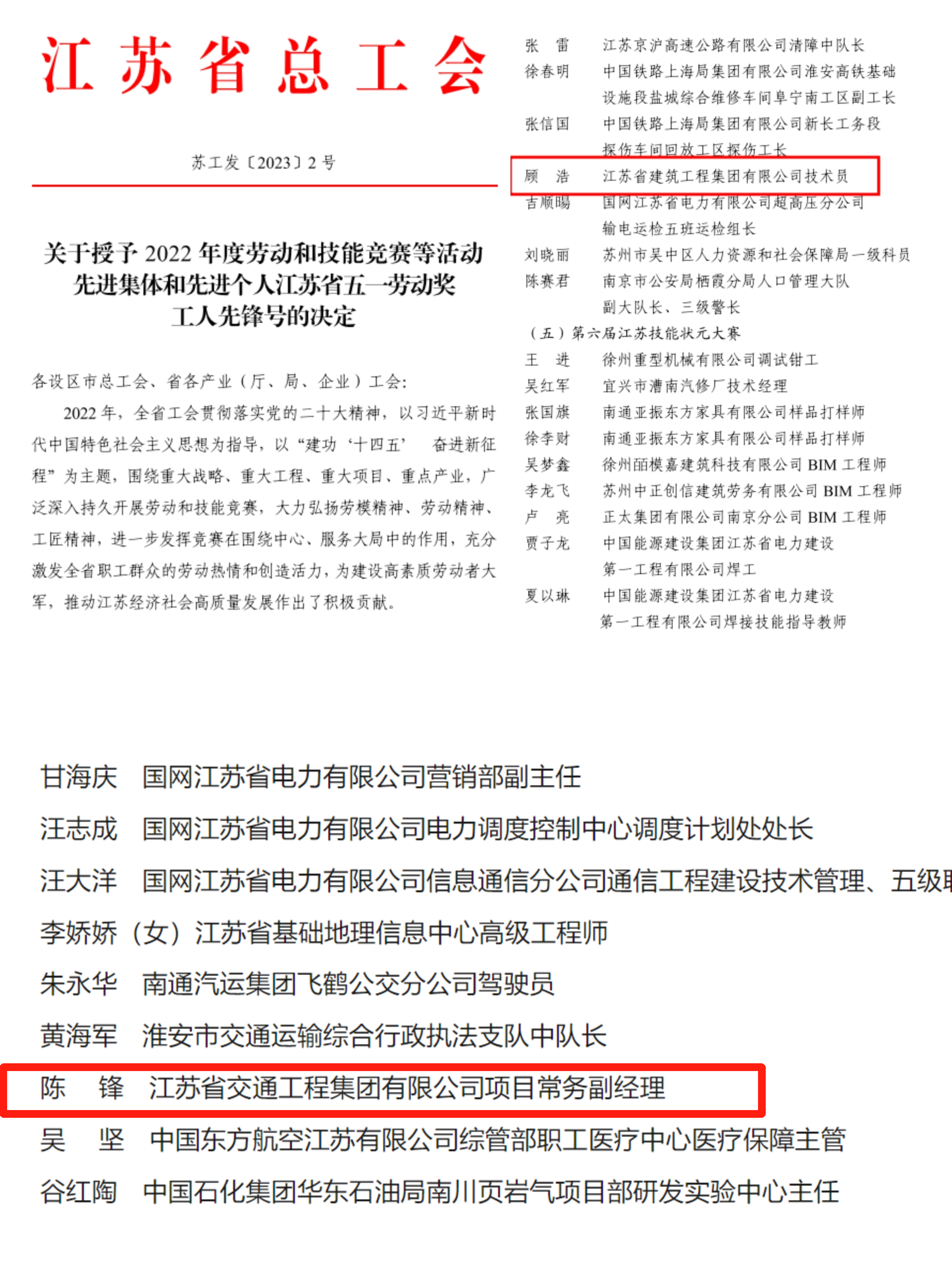 “五一”勞動(dòng)節(jié)前夕,江蘇省總工會(huì)發(fā)布《關(guān)于表彰2023年省五一勞動(dòng)獎(jiǎng)和江蘇省工人先鋒號(hào)的決定》,集團(tuán)第一工程公司顧浩、江蘇交工陳鋒榜上有名,被授予“江蘇省五一勞動(dòng)獎(jiǎng)?wù)隆薄?/p>