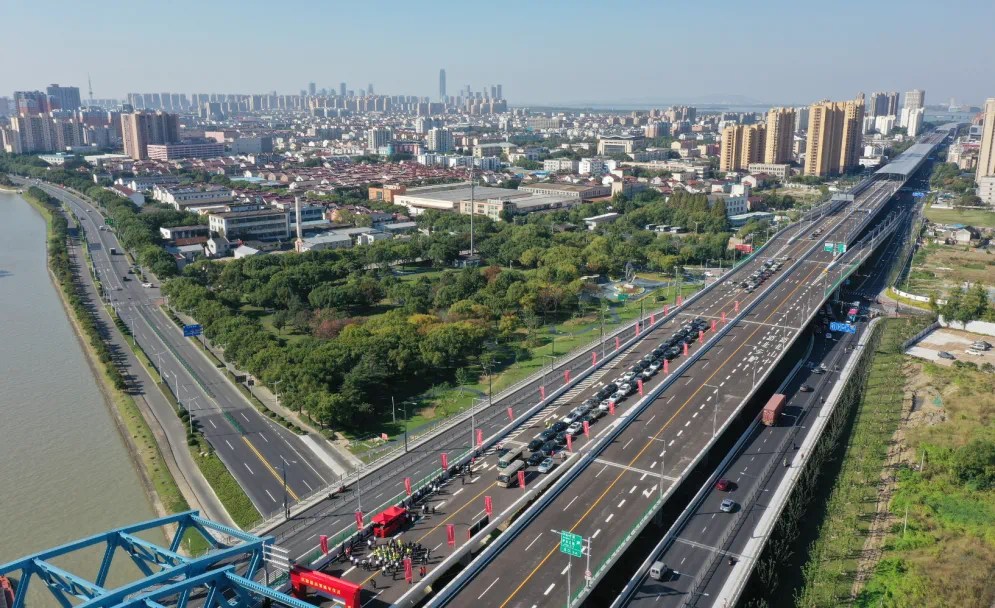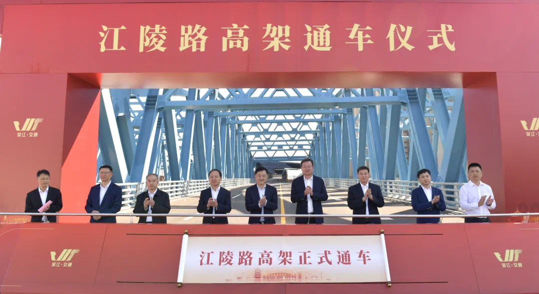 10月21日,蘇州江陵路高架正式建成通車。蘇州市交通運(yùn)輸局局長(zhǎng)焦亞飛,吳江區(qū)委書記李銘,吳江區(qū)委副書記、區(qū)長(zhǎng)王國榮,區(qū)人大常委會(huì)主任徐曉楓,區(qū)人大常委會(huì)黨組書記盛紅明等出席通車儀式并推桿。
