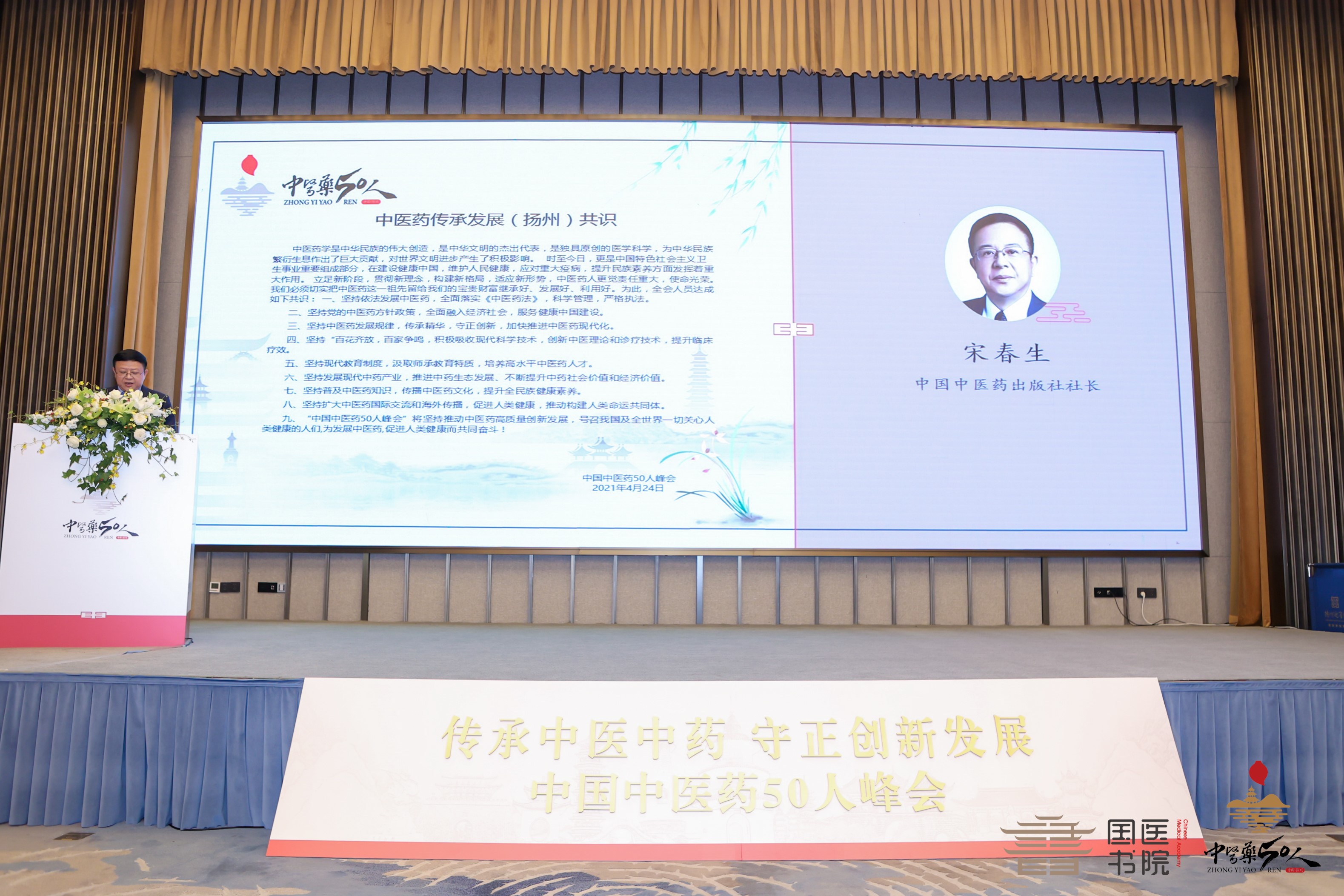 北京醫(yī)院主任醫(yī)師鄭志堅教授作為峰會主持人,為此次國醫(yī)云集、全球矚目的盛世峰會拉開序幕。揚州副市長余珽,為中國中醫(yī)藥50人峰會的開幕致辭。衛(wèi)生部原副部長、國家中醫(yī)藥管理局原局長朱慶生,衛(wèi)生部原副部長、國家中醫(yī)藥管理局原局長佘靖,國醫(yī)大師唐祖宣,江蘇省衛(wèi)生健康委副主任、江蘇省中醫(yī)藥管理局局長朱岷,在會上作精彩發(fā)言。中國中醫(yī)藥出版社社長宋春生代表大會發(fā)布了“中醫(yī)藥傳承發(fā)展(揚州)共識”。