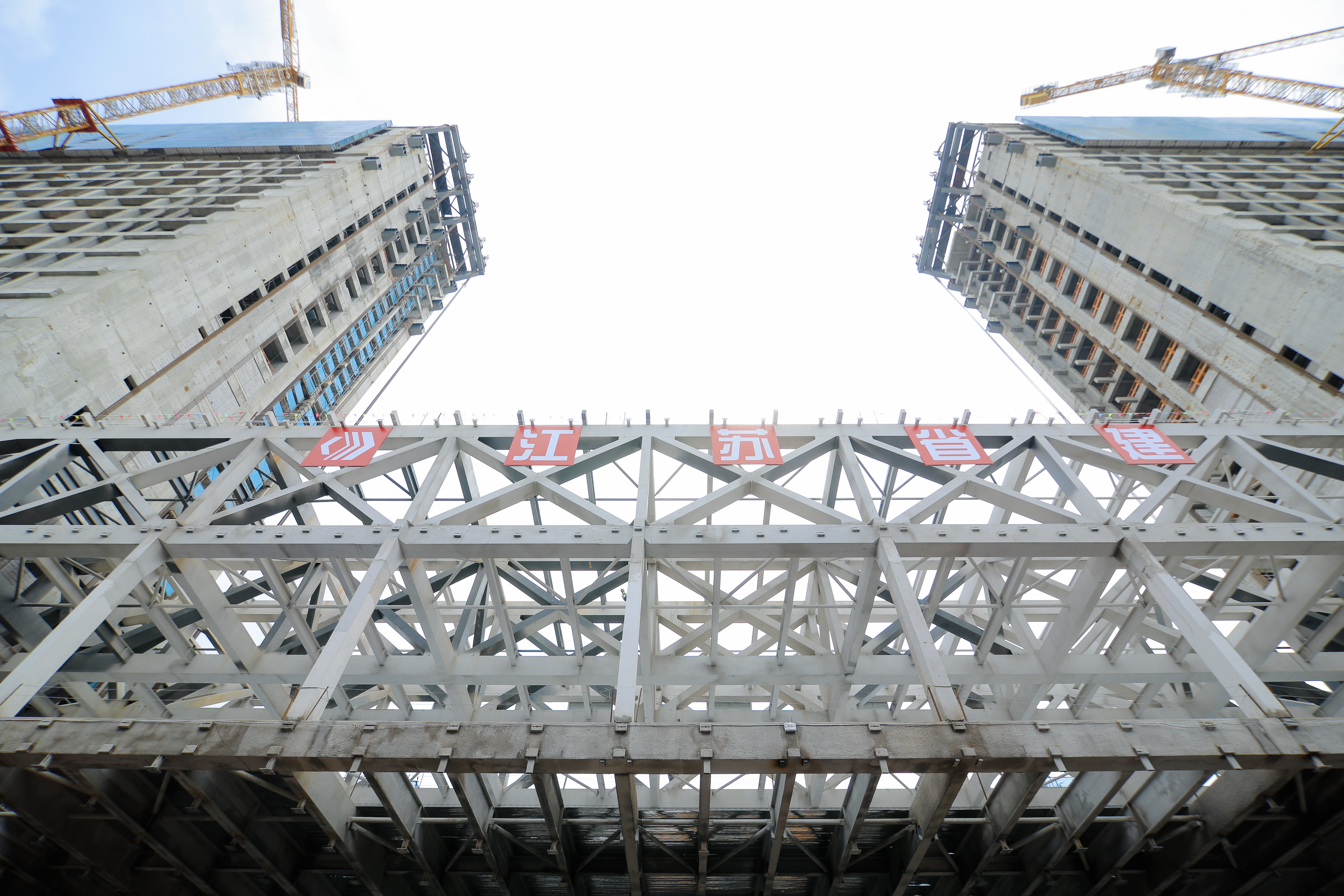 此次提升的鋼結(jié)構(gòu)空中廊橋是項目的一大設(shè)計亮點,廊橋頂標(biāo)高94.75米、跨度81米,提升重量達(dá)2600噸,三項指標(biāo)綜合位列亞洲第一。橫架在兩座塔樓之間,俯瞰建筑獨特外觀所呈現(xiàn)的漢字“中”,完美體現(xiàn)了“中國夢”、“夢之窗”的設(shè)計理念。