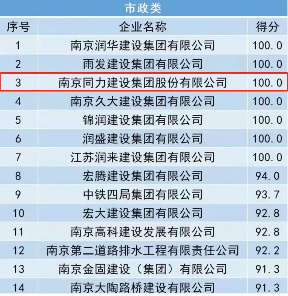 █同力建設(shè)以滿分成績占據(jù)市政類榜首