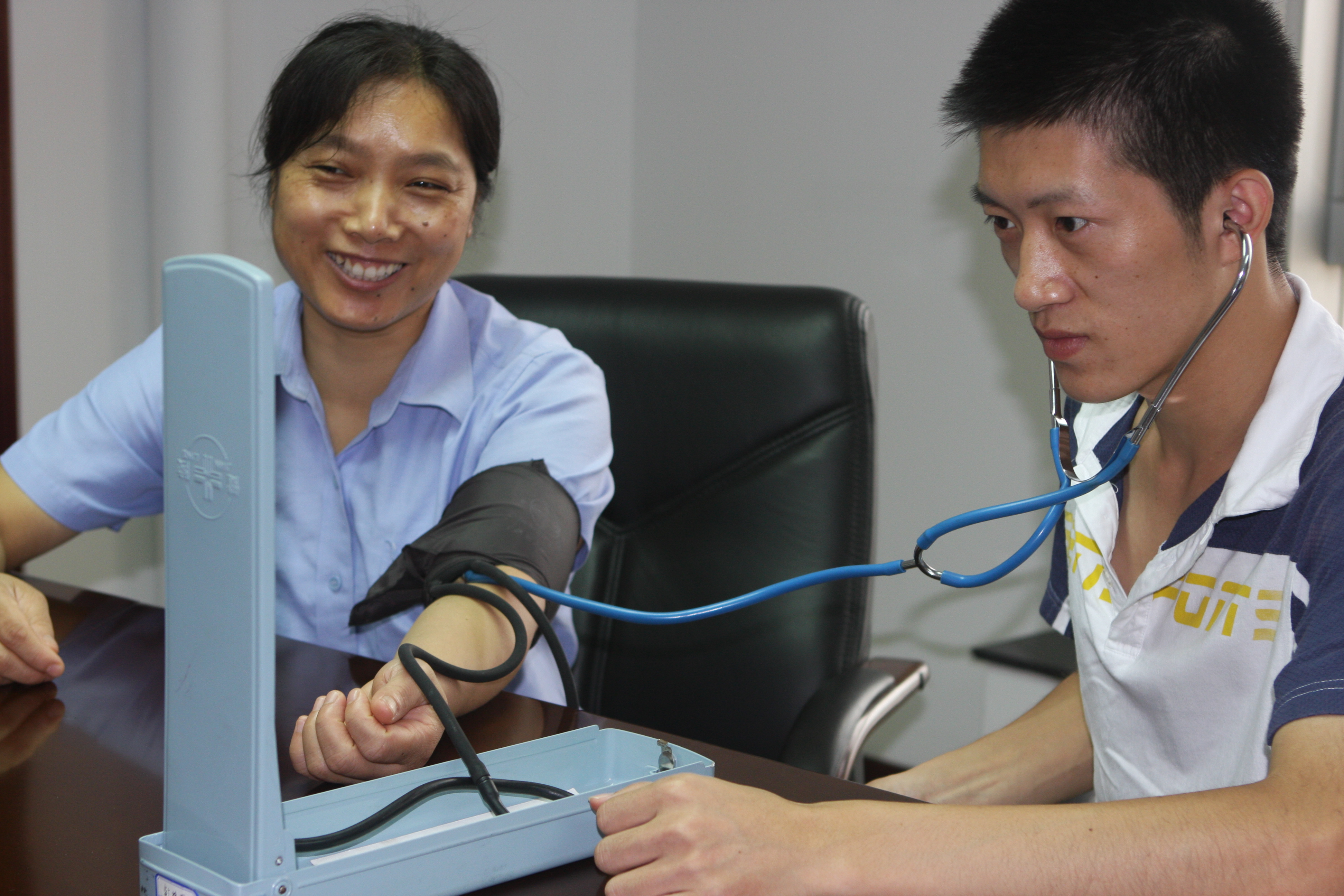 圖為大學(xué)生吳啟春在給機(jī)關(guān)職工測量血壓。