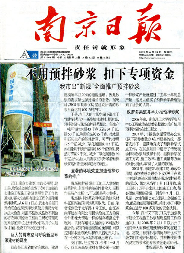 尚華預(yù)拌砂漿受《南京日報》褒揚