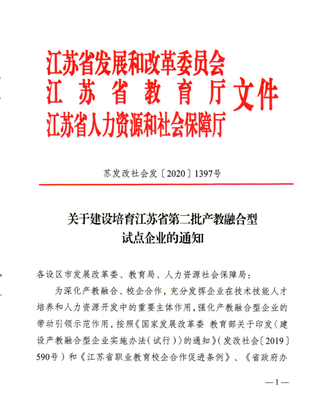 12月28日,省發(fā)改委、省教育廳、省人社廳聯(lián)合發(fā)布江蘇省第二批產(chǎn)教融合型試點(diǎn)企業(yè)名單,江蘇省建集團(tuán)成功入選,并納入江蘇省產(chǎn)教融合型企業(yè)建設(shè)培育庫(kù)。