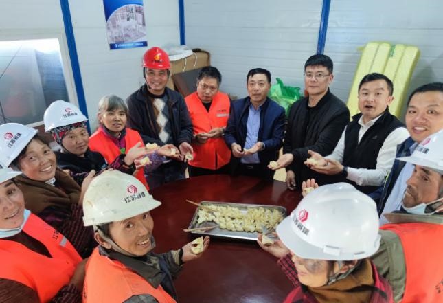 除夕,項目部組織大家一起張貼春聯(lián)和“福”字,一起動手包餃子、餛飩,并舉辦了茶話會、發(fā)放了新春禮包,工地現(xiàn)場和生活區(qū)洋溢著濃濃的過年氣氛。大家一起吃年夜飯,參加套圈、摜蛋等娛樂活動,過了一個有意義的“蘇州年”。