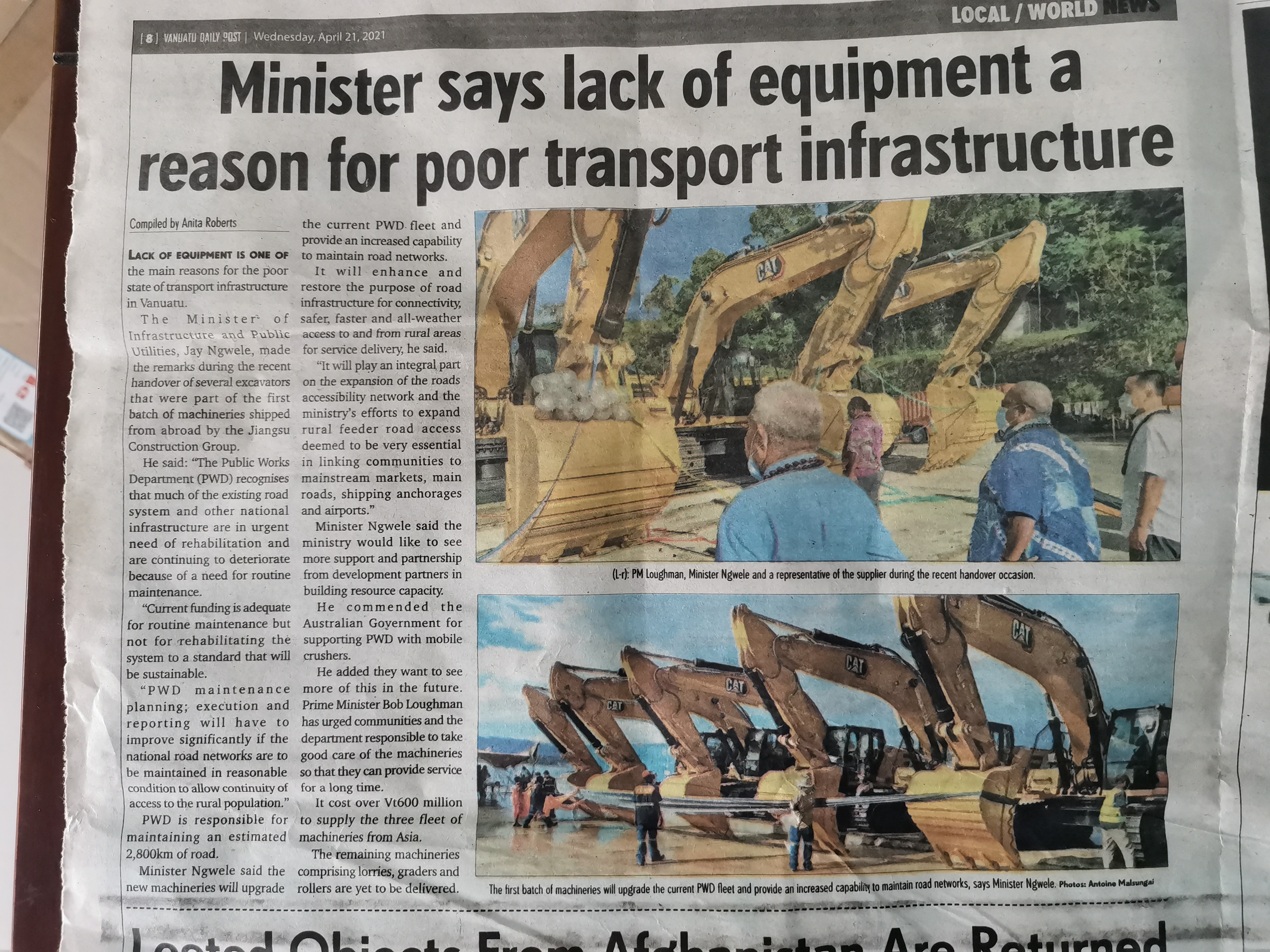 本次設(shè)備采購(gòu)是瓦努阿圖建國(guó)以來(lái)首次大額政府設(shè)備采購(gòu)項(xiàng)目,旨在政府建立自有的道路建設(shè)團(tuán)隊(duì),對(duì)此前颶風(fēng)災(zāi)害損毀的國(guó)家道路進(jìn)行重建及維修,設(shè)備包括挖掘機(jī)、壓路機(jī)、平地機(jī)、自卸車、灑水車等。