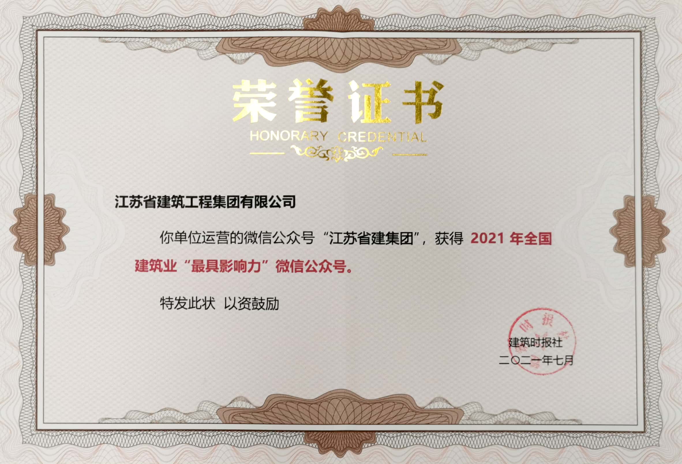 迭代傳播方式,賦能品牌價(jià)值。近日,全國(guó)建筑業(yè)2021年微信公眾號(hào)運(yùn)維經(jīng)驗(yàn)交流研討會(huì)暨優(yōu)秀公眾號(hào)頒獎(jiǎng)典禮在揚(yáng)州召開(kāi)。集團(tuán)微信公眾號(hào)“江蘇省建”蟬聯(lián)全國(guó)建筑業(yè)“最具影響力”公眾號(hào)。