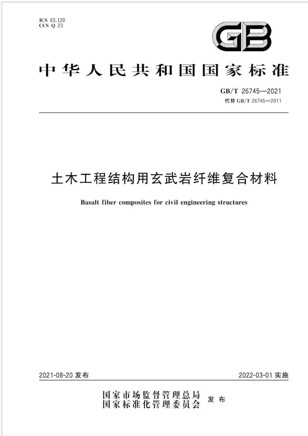近日,由江蘇綠材谷新材料科技發(fā)展有限公司主編的《GB/T26745-2021土木工程結(jié)構(gòu)用玄武巖纖維復(fù)合材料》國(guó)家標(biāo)準(zhǔn)正式發(fā)布,該標(biāo)準(zhǔn)規(guī)定了土木工程結(jié)構(gòu)用玄武巖纖維復(fù)合材料的分類、規(guī)格和標(biāo)記、要求、試驗(yàn)方法、檢驗(yàn)規(guī)則、標(biāo)志、包裝、運(yùn)輸與貯存,適用于土木工程結(jié)構(gòu)加固修復(fù)及新建結(jié)構(gòu)用玄武巖纖維復(fù)合材料。