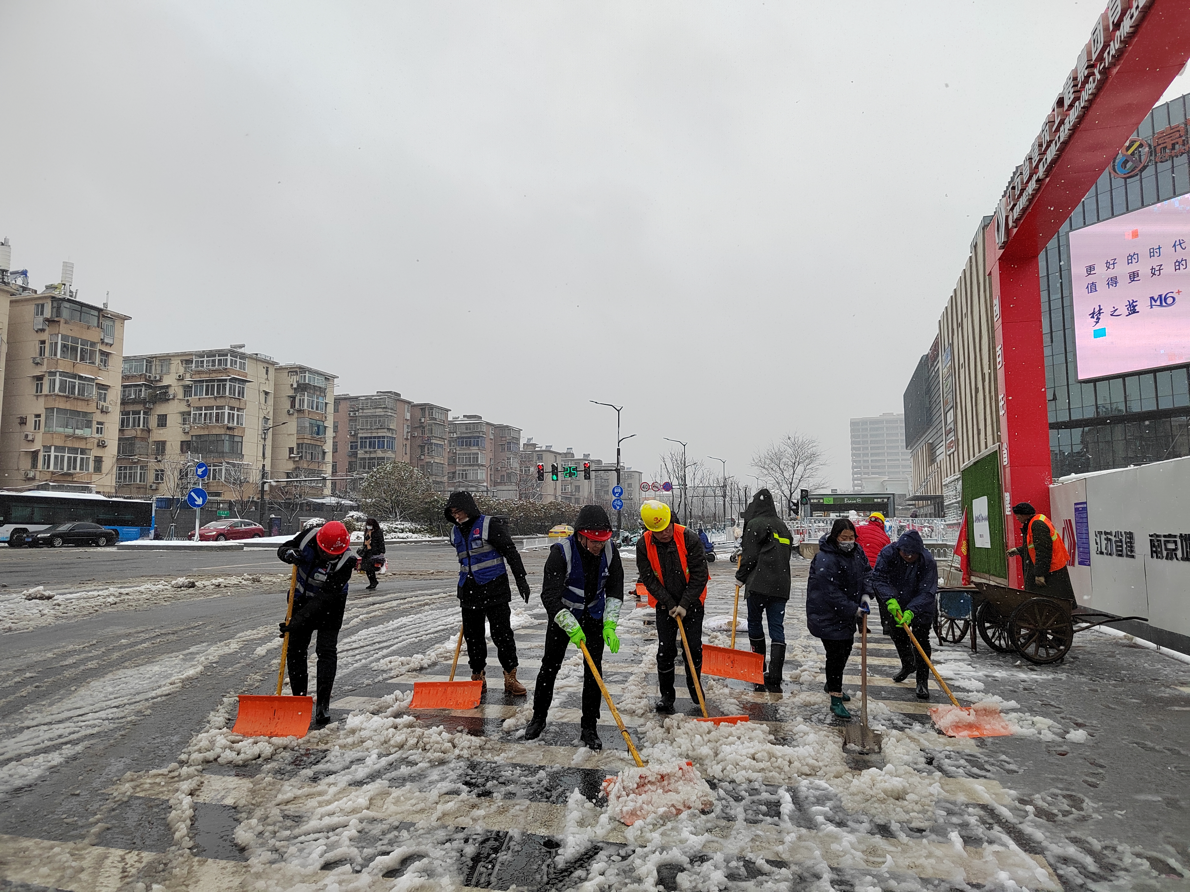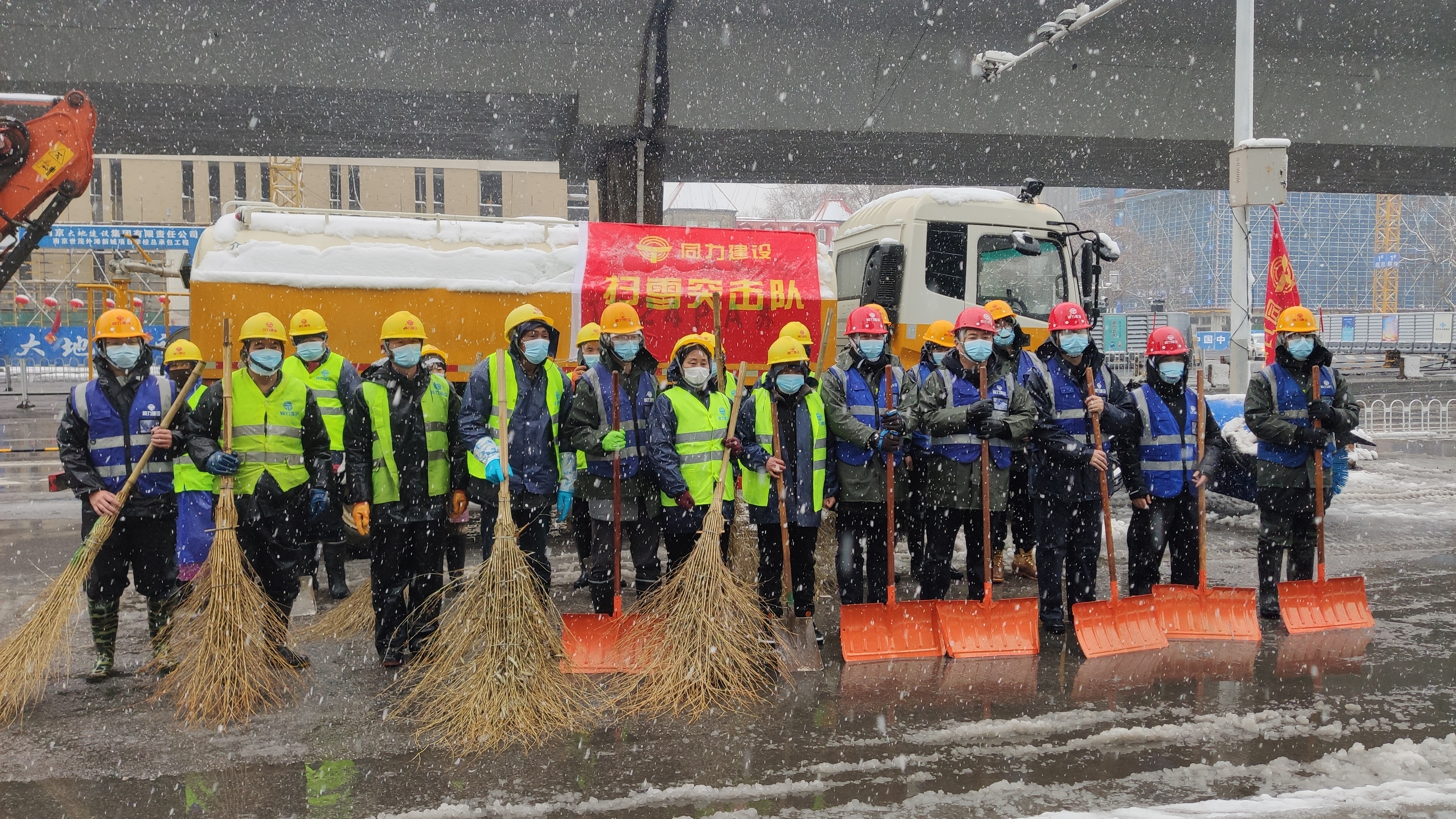 新春佳節(jié)后的第一個(gè)工作日,南京迎來(lái)了虎年的第一場(chǎng)大雪。銀裝素裹的美景為市民帶來(lái)欣喜的同時(shí),也為安全出行帶來(lái)隱患。作為南京建筑業(yè)的中堅(jiān)力量,集團(tuán)第一工程公司和同力建設(shè)按照市除雪防凍指揮部的部署,全力做好掃雪備戰(zhàn)。為保障道路暢通和行人行車(chē)安全,2月7日一早,各項(xiàng)目部以雪為令,迅速響應(yīng),主動(dòng)出擊,紛紛成立掃雪突擊隊(duì),在南京各個(gè)路段開(kāi)展掃雪除冰活動(dòng)。