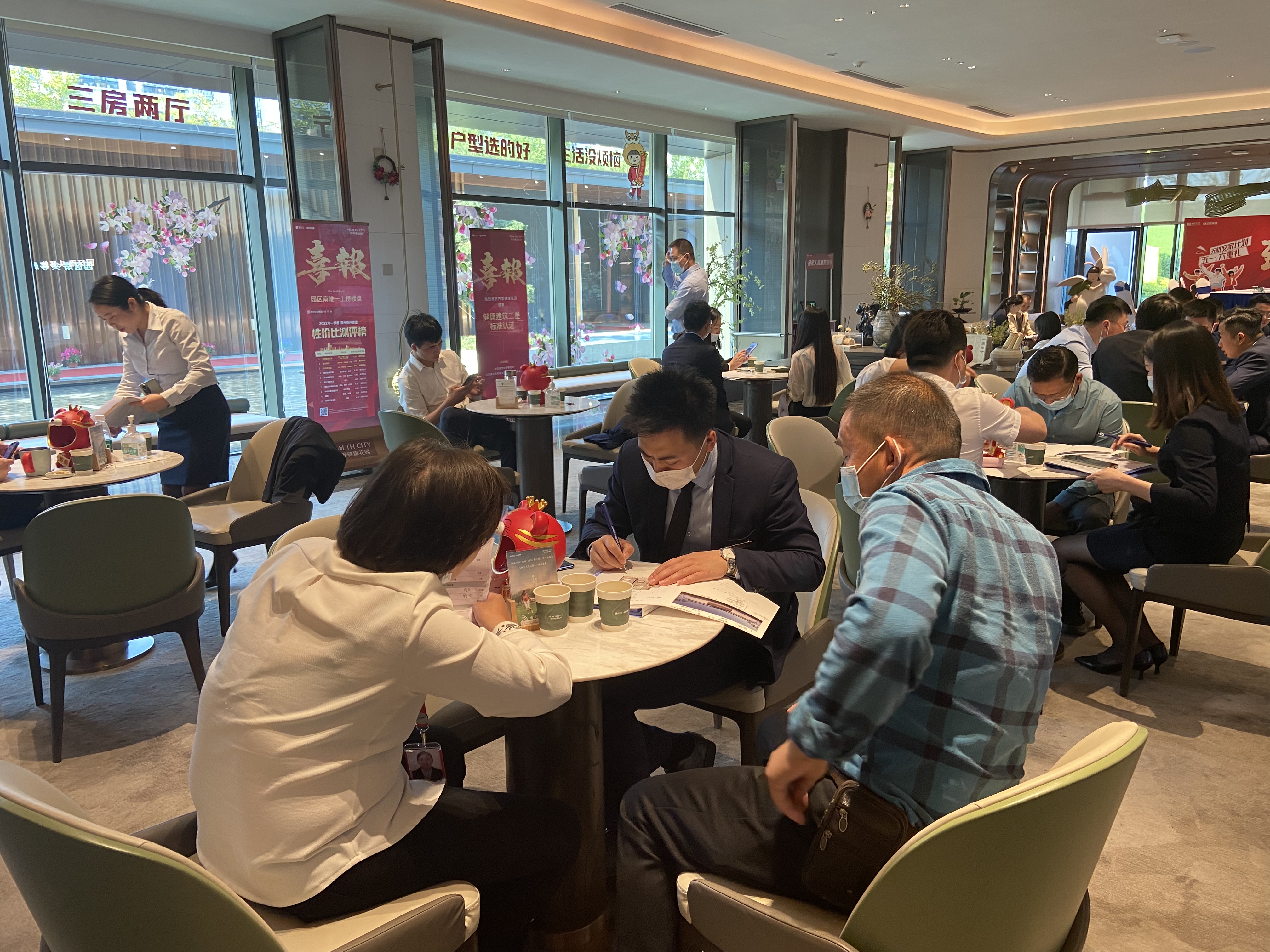 蘇州四季健康城售樓處迎來(lái)了五一黃金周上半年銷售最重要的節(jié)點(diǎn),雖然受到疫情影響,但是項(xiàng)目全體人員精神飽滿,迎戰(zhàn)五一。近期市場(chǎng)政策利好迭出,現(xiàn)場(chǎng)客戶絡(luò)繹不絕,洽談區(qū)一片熱鬧繁忙的景象,全體業(yè)務(wù)員輪接不停歇,奮戰(zhàn)案場(chǎng)銷售第一線!現(xiàn)場(chǎng)還準(zhǔn)備了特色的戶外龍蝦燒烤節(jié)、日式壽司DIY等暖場(chǎng)活動(dòng)助燃人氣。四季健康城案場(chǎng)全體銷售、策劃、后勤、物業(yè)人員自愿放棄休息,奮力實(shí)現(xiàn)五月指標(biāo)攻堅(jiān)開(kāi)門(mén)紅!